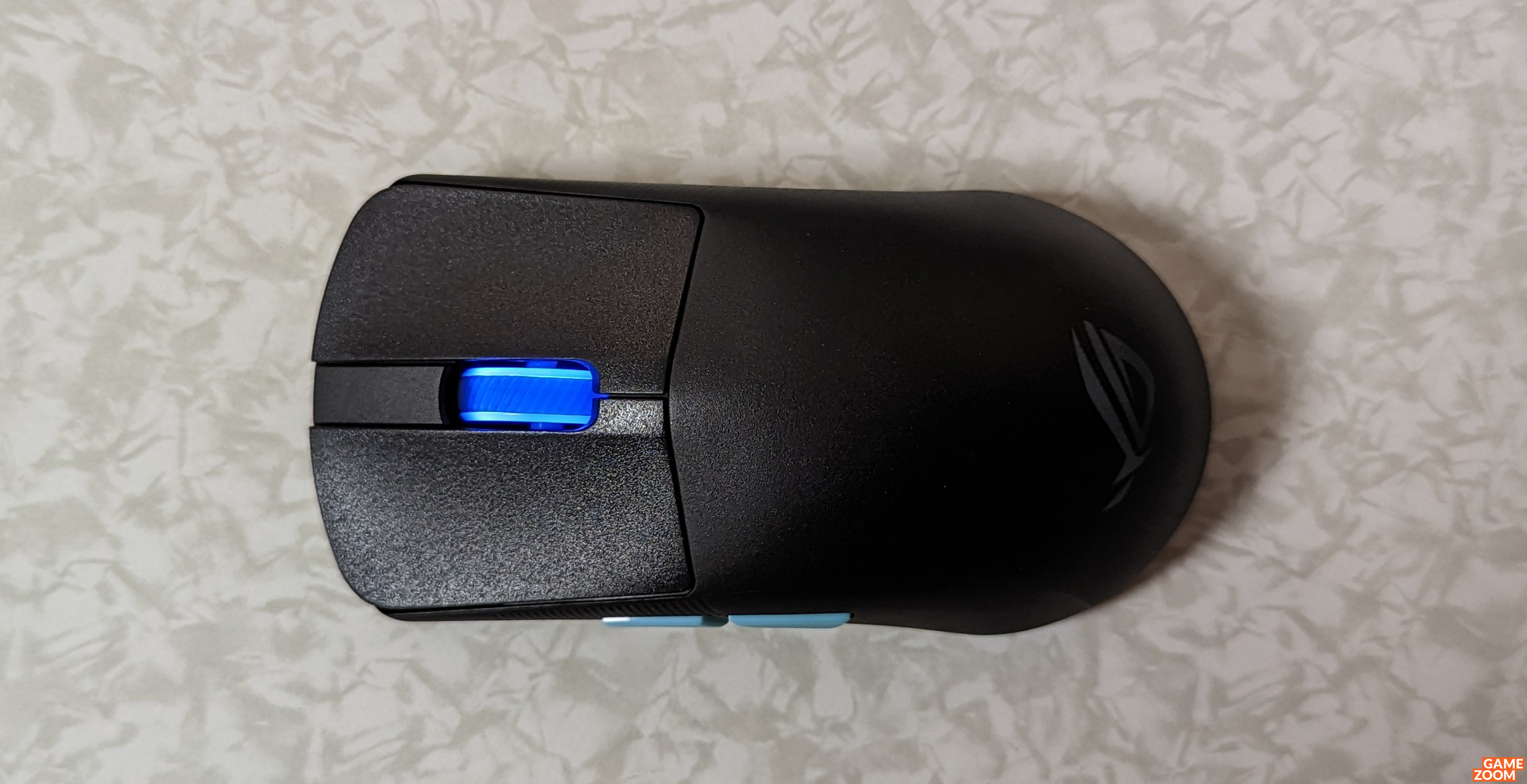 Zur Eingabe stehen insgesamt vier Tasten zur Verfügung, die allesamt frei programmierbar sind. Das Zwei-Wege-Mausrad selbst ist natürlich auch als Taste nutzbar. Unter den beiden Haupttasten wurden mechanische Schalter verbaut. Die ROG 70M sind für 70 Millionen Klicks ausgelegt und lösen mit einer Aktivierung von nur 0.2 Millisekunden ohne unbeabsichtigte Doppelklicks aus. Die Schalter verfügen über einen leichten und direkten Druckpunkt, was wir während unserer Testphase als überaus positiv empfanden. Das mitgelieferte und sehr flexible USB-C-Kabel misst ausreichend lange 2 Meter. Vier PTFE-Gleiter an der Unterseite sorgen für eine hohe Gleitfähigkeit. Ebenfalls an der Unterseite findet man den Modus-Schalter (Aus, 2.4 GHz, Bluetooth), die DPI- und Pair-Taste sowie ein Fach zum Verstauen des USB-Empfängers. Für optische Akzente sorgt die einstellbare RGB-Beleuchtung (Mausrad). Verarbeitungsmängel konnten wir an unserem Testmuster nicht feststellen.