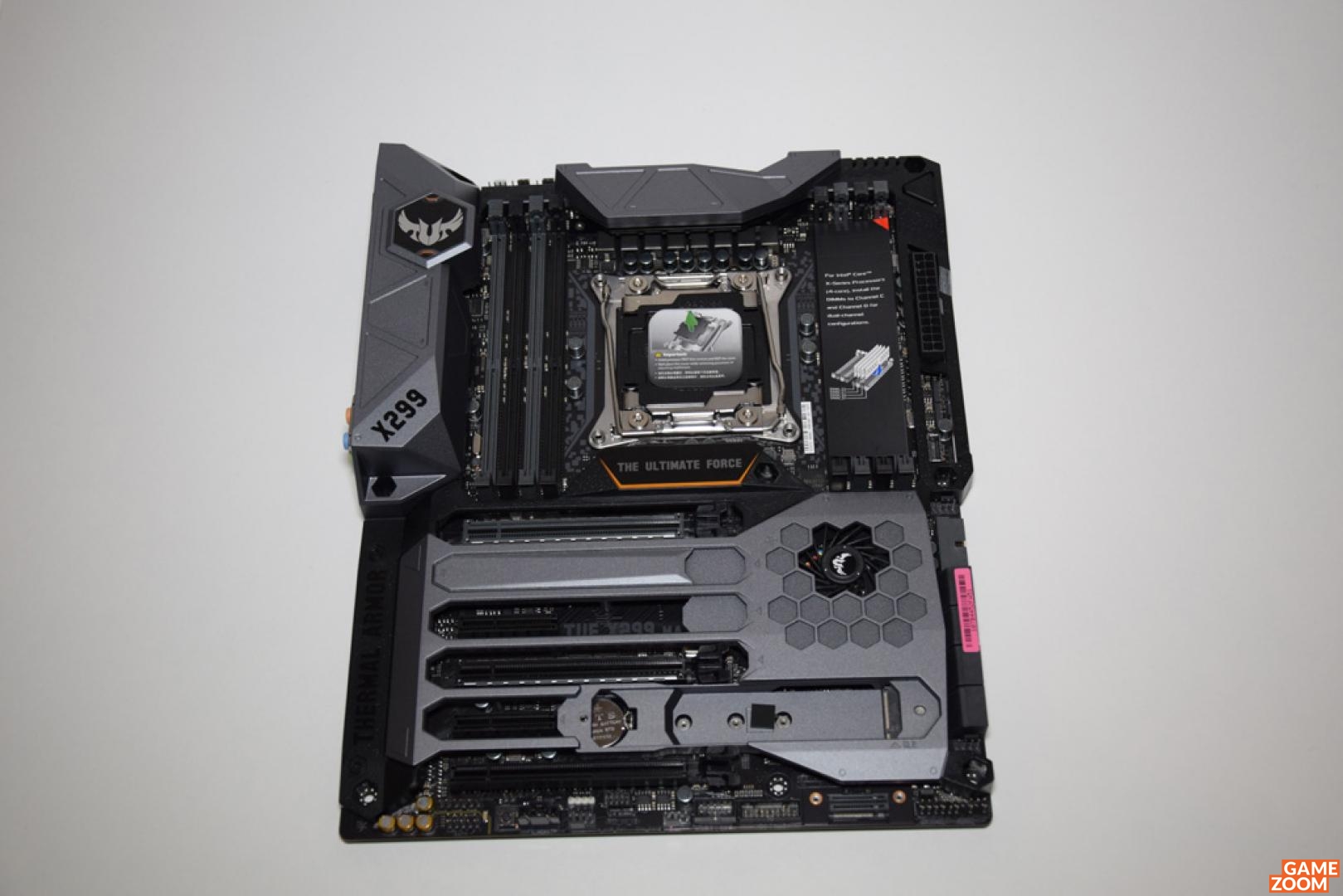 ASUS hat dem Board eine digitale Spannungsversorgung spendiert, die auf 8+4 Phasen zurückgreifen kann (8 Phasen für die CPU; 4 Phasen für die Speicher). Darüber hinaus findet man hochwertige Kondensatoren auf der Platine. Zwei der drei vorhandenen PCIe-x16-Slots kommen mit der „SafeSlot“-Technik daher. Zur Erklärung: Bei den neuen X299-Boards wirbt ASUS mit dem sogenannten SafeSlot, der vom Hersteller als besonders strapazierfähige Version eines PCIe-Slots mit Metallverstärkung beschrieben wird. Dies soll beim Einsatz von schweren High-End-Grafikkarten potentiell Vorteile bieten
