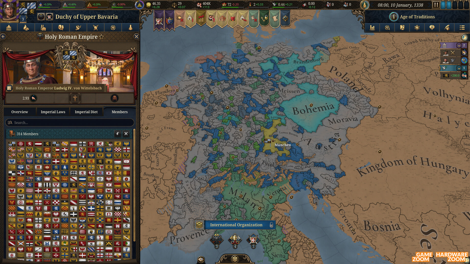 Zu guter Letzt, lasst uns über das wichtigste auf der Karte sprechen: Unsere Mitspieler. Jeder Staat, ob Grafschaft, freie Stadt oder Königreich, wird entweder vom Computer oder unseren menschlichen Mitspielern gesteuert. Mit menschlichen Mitspielern haben wir unsere ganz eigenen Herausforderungen, denn wer würde schon zu 100% dem Herzog von Bayern vertrauen, der vielleicht seine ganz eigene Agenda verfolgt? Computer-gesteuerte Staaten sind dafür etwas einfach einzuschätzen, deren Beziehung zu uns basiert voll und ganz auf guten alten Zahlen. Im Krieg enttäuschen sie uns aber oft genug. Mehr als einmal habe ich frustriert zugeschaut, wie meine Verbündeten ihre Armeen in hoffnungslose Schlachten geworfen haben, nicht aushalfen, als wir angegriffen wurden, oder einfach ziellos durch die Gegend marschiert sind. Das heißt nicht, dass alle Aktionen der NP-Staaten unsinnig sind, aber oft genug, dass es auffällt.