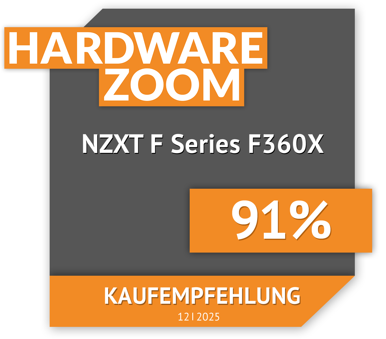 “Der NZXT F Series F360X hinterlässt im Test einen insgesamt sehr guten Eindruck und richtet sich klar an Enthusiasten, die Wert auf hohe Leistung, saubere Optik und ein aufgeräumtes Kabelmanagement legen. Der innovative Monorahmen mit drei integrierten 120-mm-Lüftern überzeugt durch eine hohe Verarbeitungsqualität, moderne Materialien wie LCP-Lüfterblätter sowie durch starke Leistungswerte bei Luftdurchsatz und statischem Druck. Auf Radiatoren liefert der F360X eine solide bis sehr gute Kühlleistung, während er bis etwa 1.500 U/min angenehm leise bleibt und damit alltagstauglich ist.