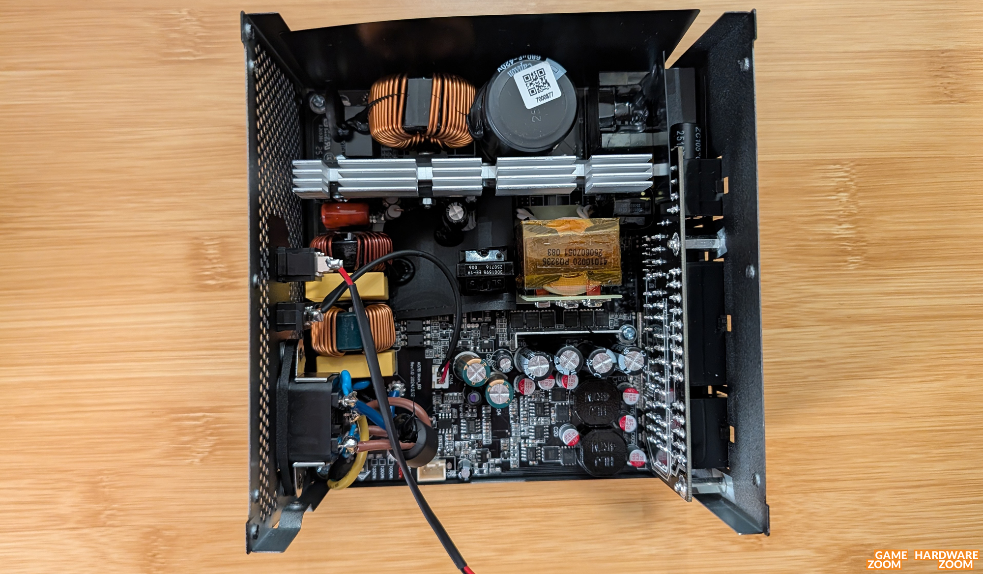 Laut Thermaltake wurde das „Design“ in Deutschland erstellt - die technische Plattform kommt aber vom OEM Andyson. Zum Einsatz kommt ein Full-Bridge-Design mit LLC-Resonanzwandler mit Synchronous Rectification und nachgeschalteten DC-DC-Spannungswandlern auf der Sekundärseite. Auf der Primärseite findet man einen CapXon Kondensator (680uF, 420V, 85°C) - die restlichen Elkos kommen von Jicon (105°C-Modelle). Demnach ist die Bauteilewahl für ein Mittelklasse-Netzteil OK - aber auch nicht mehr. Die Lötqualität im Innenraum ist sehr gut.