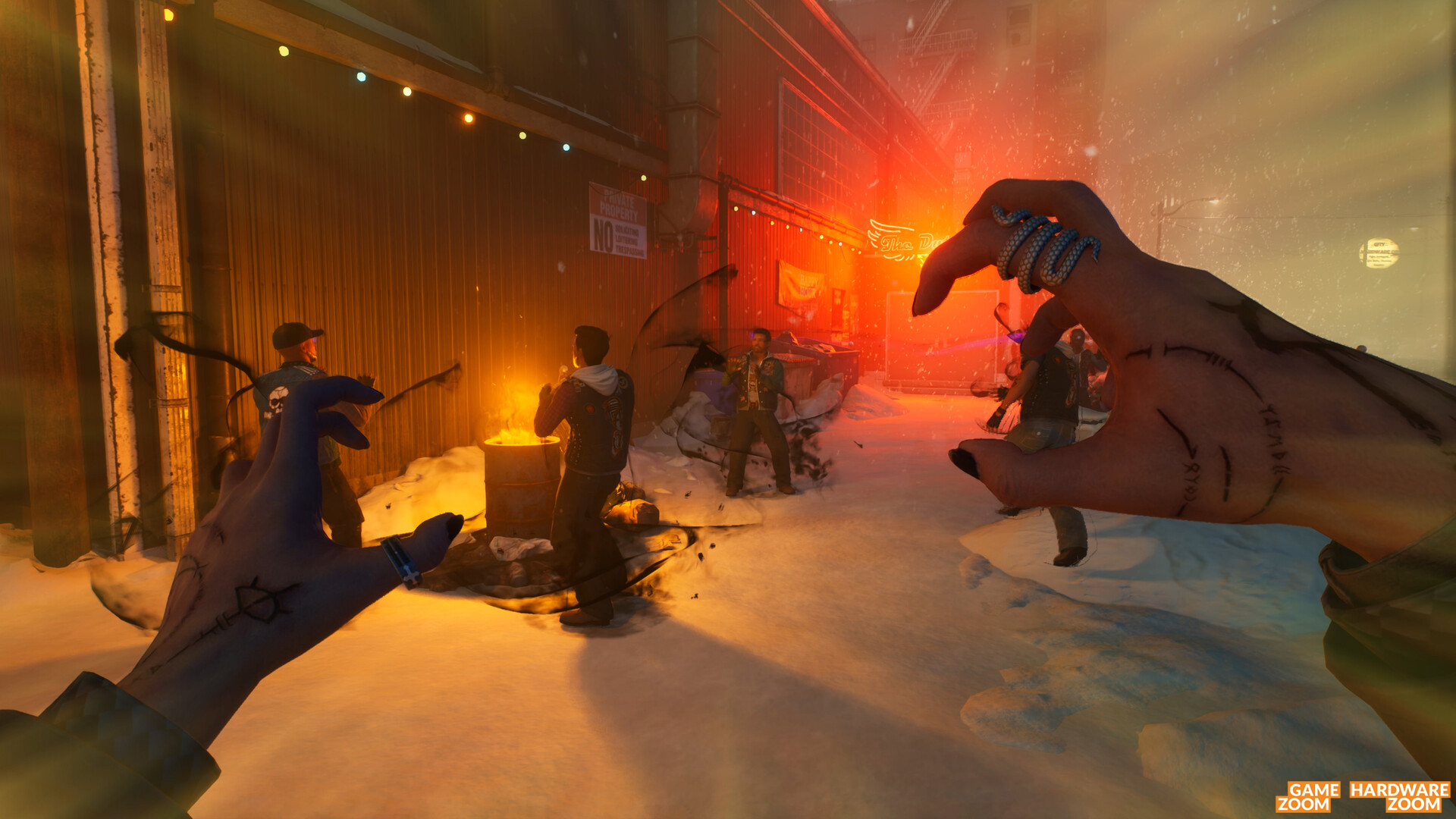 Apropos Währungen: ein Inventar gibt es nicht. Der Nomade verlässt sich ganz auf die eigenen Klauen und die magischen Kräfte im Blut… würde ich sagen, wenn es nicht etwas geschummelt wäre. Es ist wahr, dass wir mit vampirischen Krallen schlitzen und hacken, Blutpfeile verschießen und Gegner ins Reich der Schatten verbannen, ganz ohne Kartenspiele sogar. Aber wir beherrschen auch Telekinese. Das hilft uns zum Beispiel, Gegnern einen sanften Schubser vom Hochhaus zu geben, auf dem wir gerade kämpfen. Oder den Backstein in der Ecke aufzuheben, um ihn jemandem mit der Kraft einer Abrisskugel gegen den Schädel zu werfen. Lässt einer unserer Feinde allerdings sein Schießeisen fallen, krallen wir uns das mit unserem magischen Händchen. Auf den ersten Klick entleeren wir das gesamte Magazin in die Richtung, in die wir gerade schauen. Mit dem zweiten Klick donnern wir die Waffe dann in oben beschriebener Backstein-Manier in Richtung unserer Widersacher. Waffen sind also nur temporär. Aber wer braucht schon Waffen, wenn man Dolche als Fingernägel hat?