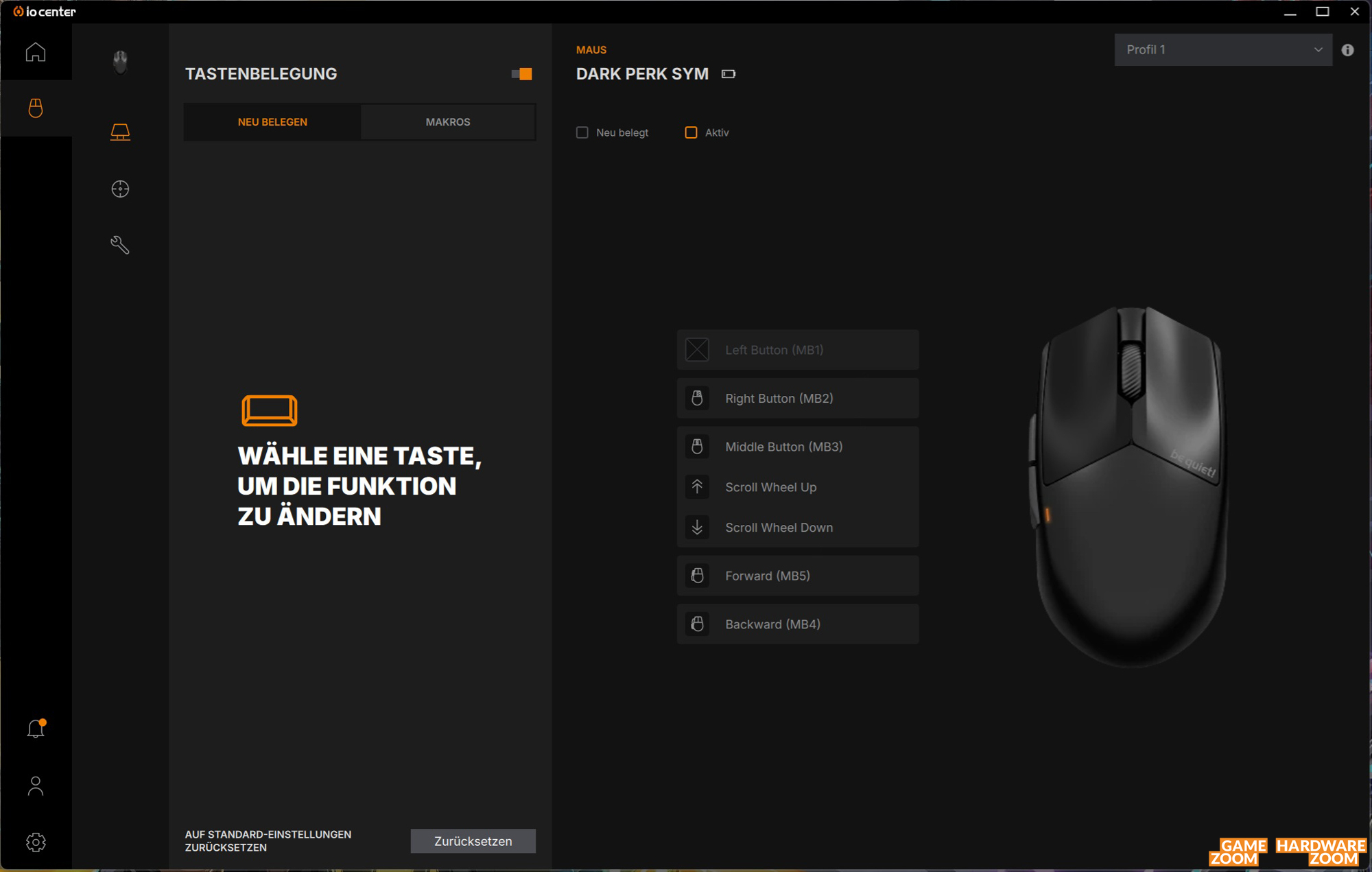 Letztere bietet nahezu den vollen Funktionsumfang der Desktop-Variante: Tastenbelegung, bis zu fünf DPI-Stufen und Feintuning für den Sensor sowie die Abtastrate stehen allesamt auch in der Web-Version des IO Centers zur Verfügung. In den erweiterten Optionen stehen folgende Einstellungsmöglichkeiten zur Verfügung: