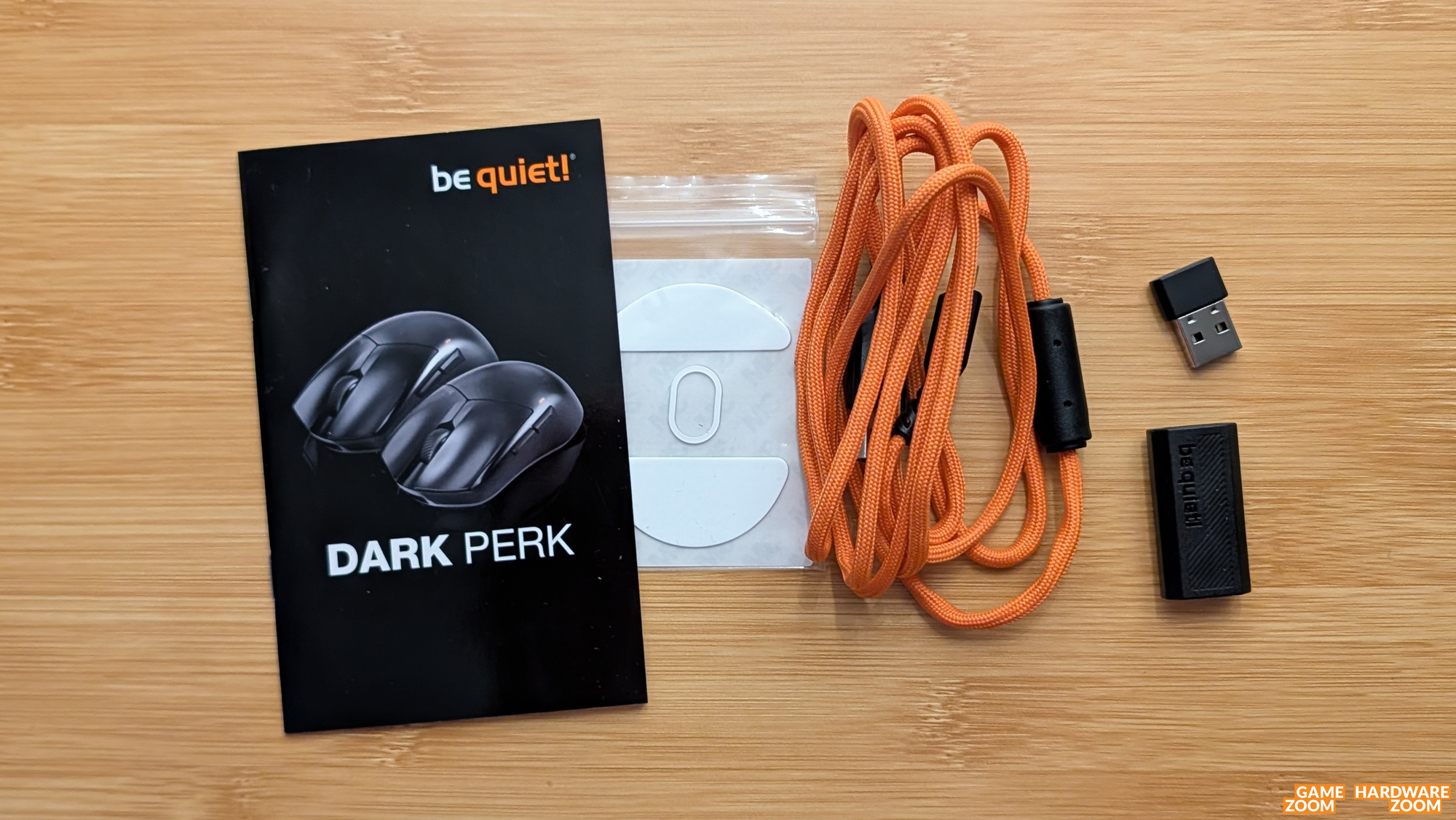 Der Lieferumfang umfasst die Maus selbst, eine Anleitung, Ersatzgleiter, ein orangefarbenes und 1.8 m langes USB-C-Anschlusskabel, einen Adapter von USB-C-Stecker auf USB-A-Buchse und einen 2.4-GHz-Empfänger mit USB-A-Stecker.