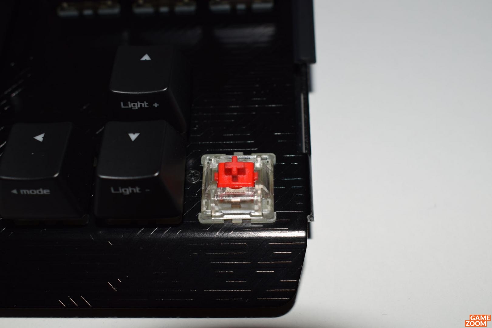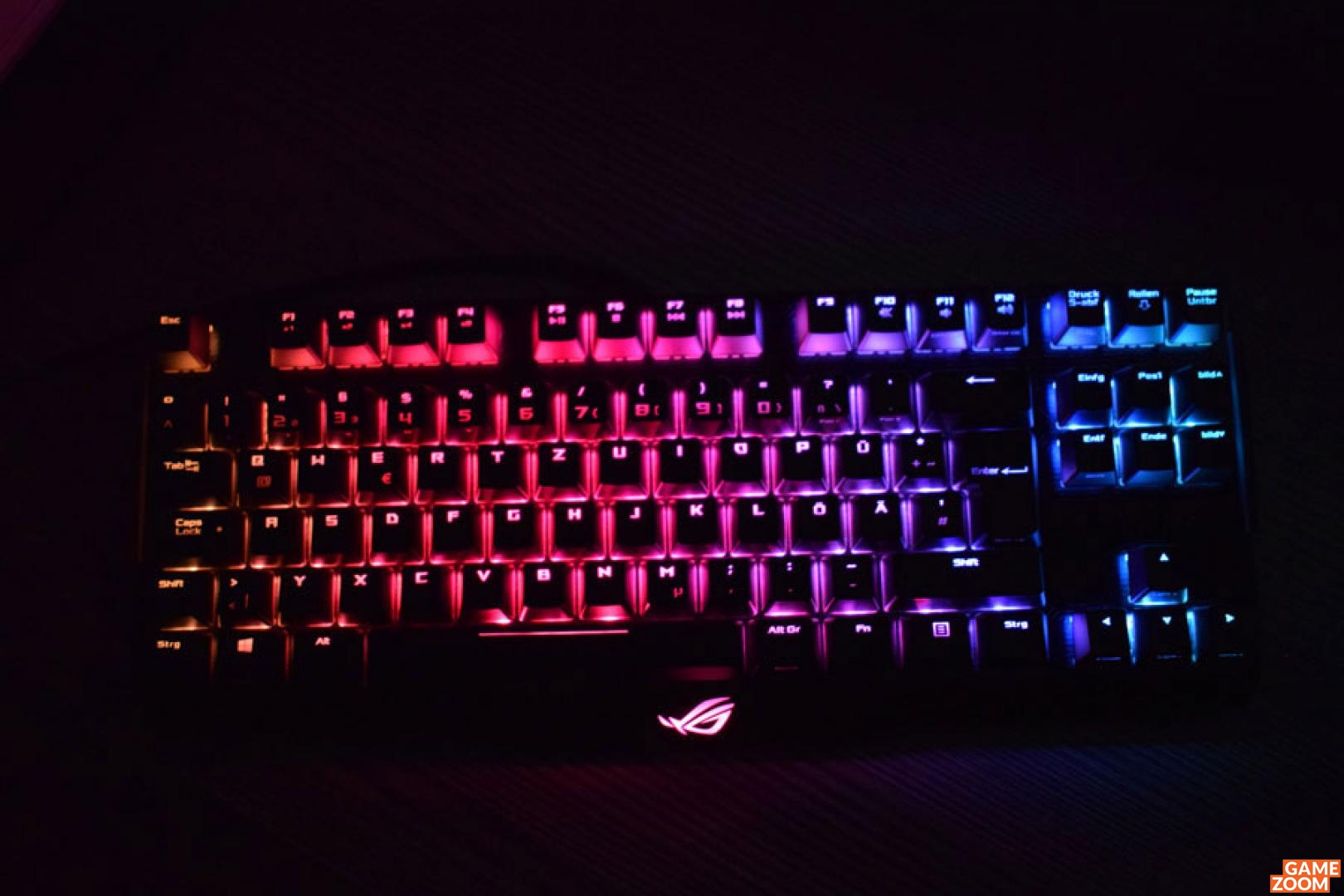 Anschlag und Alltagstest Das Besondere an der Tastatur ist der bei jeder einzelnen Taste nicht über eine elektronische Folie, sondern über einen mechanischen Mikroschalter (Cherry MX-RGB-Red) weitergegebene Tastendruck. Dabei hat ASUS den Tastenhub halbiert (beträgt zwei Millimeter). Der kurze Weg soll dem Spieler eine niedrige Reaktionszeit mit der Tastatur ermöglichen. Der dabei aufzuwendende Tastendruck ist extrem gering und liegt mit 45 Gramm deutlich unter dem, der bei Folientastaturen (80 Gramm) oder anderen mechanischen Tastaturen (60 bis 80 Gramm) aufgeboten werden muss. Laut Hersteller besitzen die Tasten eine Lebensdauer von 50 Millionen Anschlägen.
