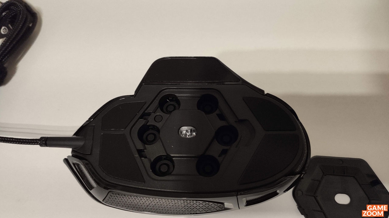 Unter den beiden Hauptmaustasten wurden langlebige Omron-Schalter verbaut (50 Mio. Klicks), die präzise, leichtgängig und mit angenehmen Druckpunkten arbeiten. Das klickbare Mausrad arbeitet ebenfalls leichtgängig und fehlerfrei. Unser Testmuster bringt knapp 119 Gramm auf die Waage (ohne Kabel) - das Gewicht lässt sich anpassen. Die mitgelieferten sechs Gewichte können bei Bedarf am Mausboden eingesetzt werden. Dafür muss eine Kunststoffabdeckung entfernt werden. Fünf Teflonfüßchen sorgen für eine hohe Gleitfähigkeit.