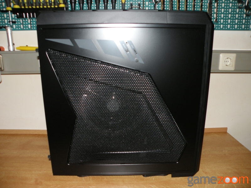 Groß und schwer, schält sich das Gehäuse aus dem Überkarton. Das matte Schwarz ist leicht empfindlich für Fingerabdrücke, wirkt aber auf den ersten Blick sehr imposant. Die Front ist von oben bis unten mit 5,25“ Blenden bestückt die mit Mesh-Gittereinsätzen besetzt sind. Beide Seitendeckel werden mit Großkopfschrauben gesichert und lassen sich einfach nach vorne herausklappen. Der Innenbereich ist frei von scharfen Kanten, bis auf die Ränder der Festplattenbuchten, denen ein bisschen mehr Rundschliff gut getan hätte. Dabei sei zu erwähnen, dass alle Platten ausschließlich vertikal mit aufgesteckten Schienen eingesetzt werden. Am linken Seitendeckel findet man neben einem großen Lüfter auch noch eine Lüfter-Steuerung, mit der man die Umdrehungsgeschwindigkeit und auch die Farben verändern kann. Allerdings wird nur der große seitliche Lüfter angesteuert, nicht die beiden Front-Lüfter. Das Gehäuse ist zur Gänze aus SECC Metall gefertigt, welches sowohl Außen wie auch Innen mattschwarz lackiert ist. Auf der Oberseite und an den Seitenbereichen der Front wurde ABS Kunststoff eingesetzt. Vier drehbare Standfüße sorgen für einen sicheren Stand. Rundum eine ausgezeichnete Verarbeitung.