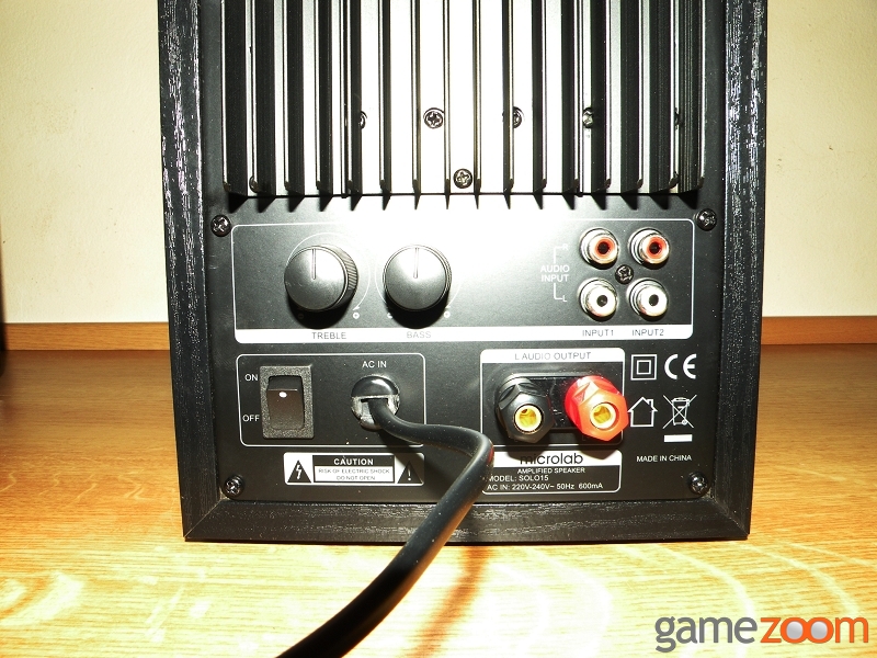 Die sehr ordentlich verarbeiteten Lautsprecher machen eine gute Figur. Dank der hochglänzenden Fronten, die für eine alternative Optik nicht abnehmbar sind, passen sie in jedes Wohnzimmer und auch zu jedem aktuellen Monitor. Das recht hohe Gewicht stammt von der aktiven Verstärkereinheit sowie vom robusten Bau aus MDF Platten. Mit einer Größe von 168 x 315 x 238 mm (BxHxT) wirken sie auch neben einem PC-Monitor nicht zu groß. An der Rückseite des aktiven Lautsprechers, befinden sich sämtliche Anschlüsse. Der zweite Lautsprecher besitzt nur die Schraubklemmen für ein 2 Poliges Lautsprecherkabel. Ebenfalls an der Rückseite angebracht, die Regler für Bass und Treble. Der Lautstärkeregler befindet sich an der rechten Seite, wo er sauber eingearbeitet wurde, damit er nicht über die Höhe der Seitenwand herausragt. Eine LED unterhalb des Volumenreglers sorgt für die Betriebsanzeige.