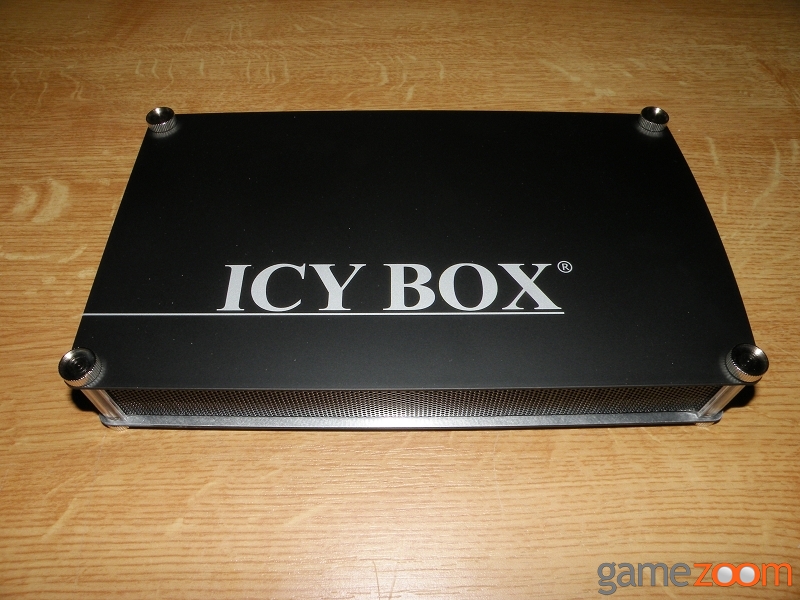Das Gehäuse besteht zur Gänze aus Aluminium, wobei man da auch nur Boden und Deckel rechnen kann, da die Seitenwände zwecks Belüftung aus Mesh-Gitter gefertigt wurden. Der Aufbau ist simpel, da oben wie auch unten jeweils vier Schrauben für den Zusammenhalt sorgen und die auch werkzeuglos demontierbar sind. Entfernt man den Deckel, kann man die Seitenteile entfernen und reinigen. Man erhält auch so Zugang zum Innenbereich um eine Festplatte einzubauen, welche über den Bodenteil und mit vier mitgelieferten Schrauben gesichert wird. Der Einbau dauert nicht länger als drei Minuten und könnte nicht einfacher sein. Die Verarbeitung ist mittelmäßig, da sich der schwarze Lack an den Kanten bei häufiger Nutzung, sprich beim Transportieren, relativ schnell abnutzt. Auch die weniger schön polierten Innenflächen von Deckel und Boden sind an den Rändern zu sehen. Hier wäre zumindest im Randbereich ein schwarzer Lack optisch ansprechender gewesen, oder eben wirklich gut polierte Flächen. Weiche Schaumstoffpuffer (im Lieferumfang) dämpfen Vibrationen bei einer waagrechten Aufstellung. Für eine senkrechte Aufstellung wurde ein Kunststoffstandfuß mitgeliefert, der jedoch über keine Vibrationsabsorber verfügt.