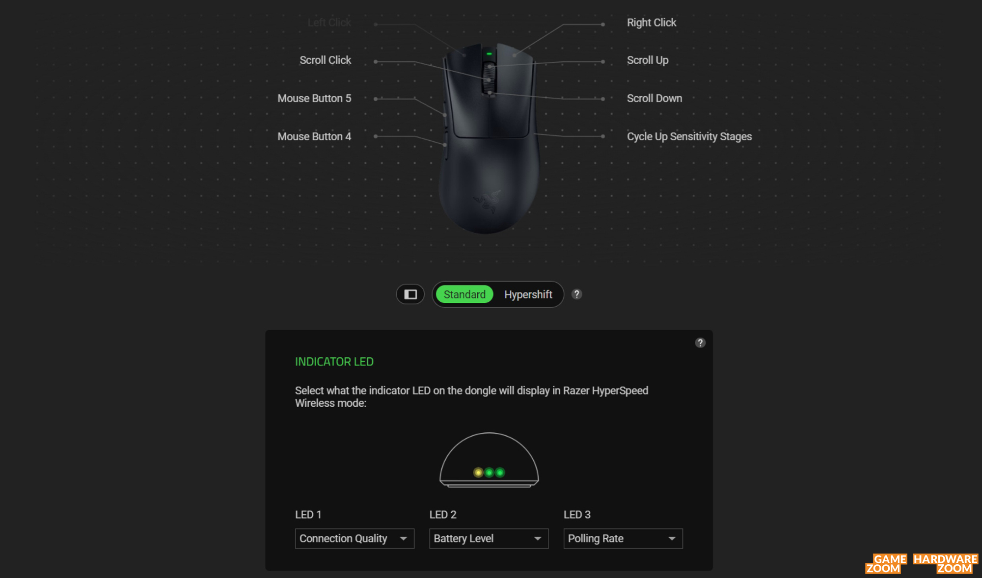 Mit dem mitgelieferten Hyperpolling Wireless Dongle ist sogar eine Polling Rate von 8.000 Hertz möglich. Dadurch reduziert sich die Verzögerung (Latenz) effektiv von 1 ms auf 0.125 ms. Leider unterstützen bislang nicht alle Spiele diese Technik. Bei Titeln, die bei 8.000 Hz Polling Rate weder ruckeln noch Probleme bereiten, spüren die Profis sicher den Unterschied zwischen 8.000 Hz und 1.000 Hz. Der Gelegenheits-Gamer nimmt die geänderte Polling-Rate dagegen wohl nur durch drastisch sinkenden Akkulaufzeiten wahr: