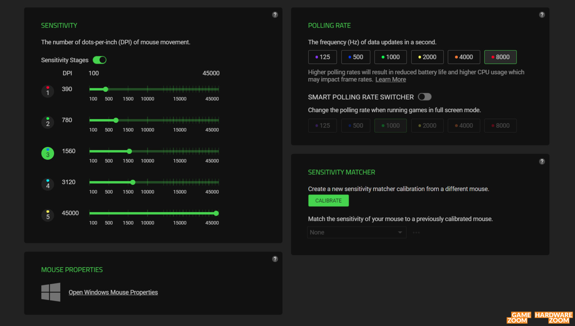 Die Lift-Off-Entfernung kann nun für das Abheben und Aufsetzen getrennt und in 26 statt 3 Stufen gewählt werden. Dank der Kalibrierungsmöglichkeiten kann man die Hubhöhe (Lift-off-Distanz) bis auf 0.9 mm minimieren. „Dynamische Empfindlichkeit“ passt die Abtastrate zudem abhängig von der Bewegungsgeschwindigkeit der Maus anhand einer festgelegten, einstellbaren Kurve an. Das soll das präzise Zielen in Shootern mit geringer Abtastrate, aber auch schnelle Drehbewegungen und Reaktionen ermöglichen. Die Funktion „Mouse Rotation“ erlaubt es einen, die physische Ausrichtung der Maus softwareseitig zu kompensieren, sodass auch horizontale Bewegungen bei einem schrägen Maus- oder Mauspad-Setup möglich sind.