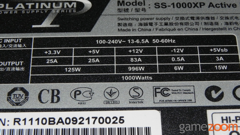 • 120mm Lüfter • aktive PFC • Anschlüsse (abnehmbar): 1x 20/24-pin, 1x 8-pin EPS12V, 1x 4/8-pin ATX12V, 6x 6/8-pin PCIe, 11x SATA, 8x IDE, 2x Floppy • +3.3V: 25A • +5V: 25A • +12V: 83A • -12V: 0.5A • +5Vsb: 3.0A • durchschnittliche Effizienz: 91%, 80 PLUS Platinum zertifiziert • sieben Jahre Herstellergarantie • BxHxT: 150x86x190mm