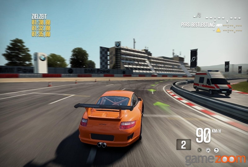 Aller Anfang ist schwer. So auch in Shift 2, sofern man auch den mittleren bis hohen Schwierigkeitsgrad wählt. Wir beginnen mit einem Kleinwagen der Golfklasse und versuchen uns auf bekannten authentischen Rennstrecken. Streng nach offiziellen Regeln starten wir und versuchen uns bestmöglich zu platzieren. Zwei Runden sind schnell vorbei und Fahrfehler kosten normalerweise gleich ein oder zwei Platzierungen, sofern die Fehler nicht besonders schwerwiegend sind. Gut, wir schrauben den Schwierigkeitsgrad mal runter und machen auf Anfänger. Siehe da, mit einer eingeblendeten Ideallinie und einem automatischen Bremsassistenten schaffen wir es auf Anhieb auf Platz 1. Die erste Trophäe, ein paar saftige XP-Points die für neue Lackierungen und anderen unnützen Kram benötigt werden sowie ein nettes Preisgeld, welches für das laufende Tuning dringend benötigt wird. Weiter zur nächsten Rennstrecke und auch dort erfolgreich abgeschlossen, zeigt dass der Anfängermodi für Neulinge und Gelegenheitsspieler ideal gewählt ist. Eine Stufe höher darf man bereits selbst bremsen, was auch noch nicht wirklich anstrengend wirkt, da man ja noch die Pfeile für die Ideallinie angezeigt bekommt, die sich auch in kritische Zonen teilt und dabei die Farbe von Grün auf Gelb und dann noch auf Rot umschaltet. Bei diesem Schwierigkeitsgrad merkt man auch noch, dass Ausrutscher oder besser gesagt kurze Abstecher ins Gemüse nicht mehr so leicht zu kaschieren sind. Bei höchster Schwierigkeitsstufe heißt es reinbeißen und fahren wie es auch die Echten tun. Keinerlei Hilfen die uns einen Vorteil verschaffen und kein Verzeihen von Fahrfehlern, das hat schon Simulationsniveau. Eine besondere Neuerung bietet die Ansicht Helmkamera, die sich nicht nur starr auf das Geschehen vor uns richtet, sondern auf die aktuelle Situation regiert, wie ein Blick auf die Konsole, den Schnittpunkt der nächsten Kurve oder man mit einem anderen Fahrzeug touchiert. Auch wenn man dies Ansicht als innovativ und vor allem neu bezeichnen kann, ist es wohl Geschmacksache ob sie auch gefällt. Dank des netten Fuhrparks von ganzen 120 Fahrzeugen, kann man seinen fahrbaren Untersatz wechseln wie man Lust hat, ohne öfters mit demselben Fahrzeug unterwegs zu sein. Selbstverständlich gibt es auch wieder die Möglichkeit sein Auto optisch aufzupeppen. In den insgesamt 35 Locations dürfen wir auf ganzen 120, zum Teil nur leicht veränderten Strecken, unser Können unter Beweis stellen.